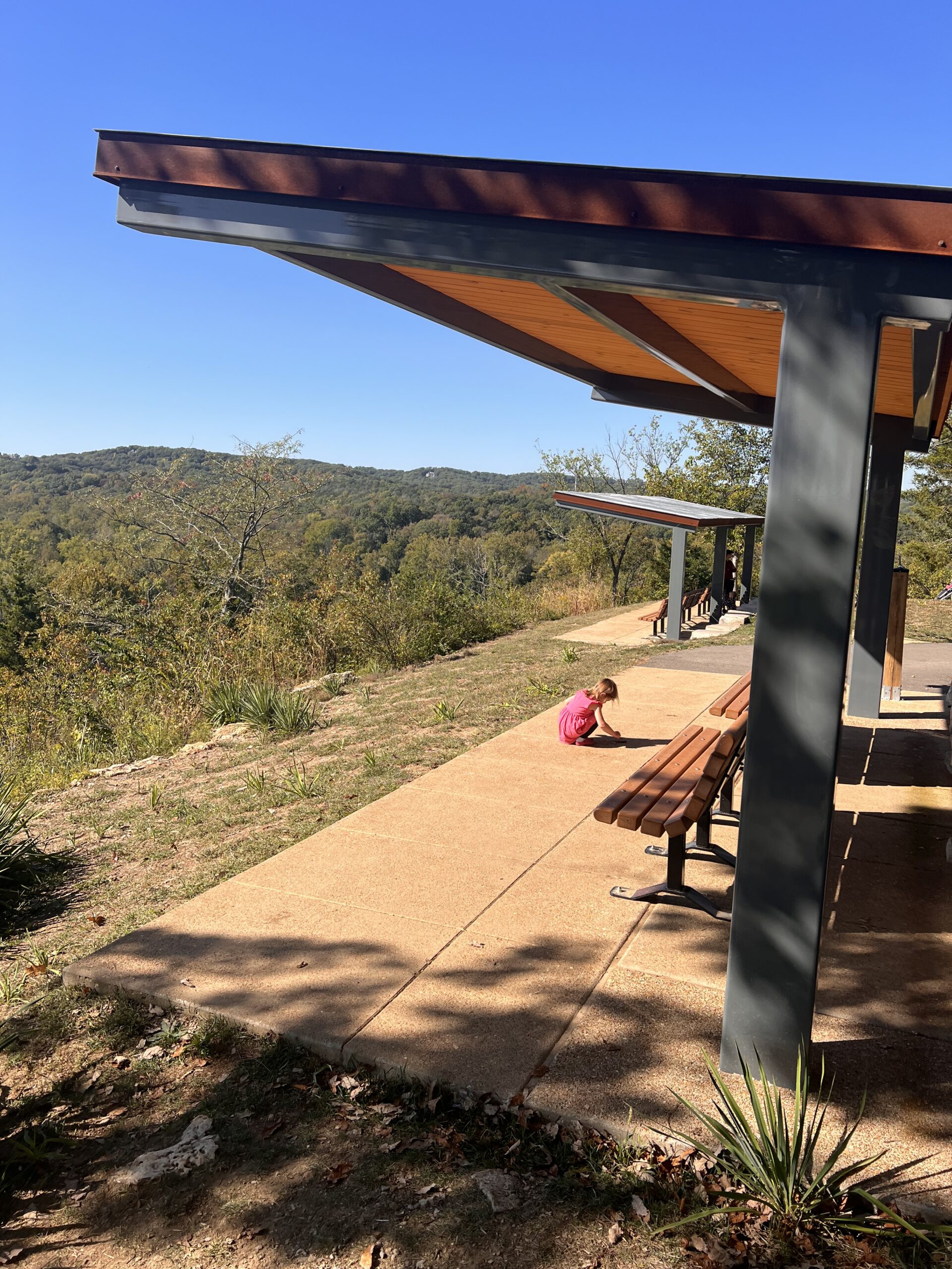 Bluff View Park is a beautiful trail in Wildwood. This is a ½ mile paved trail to a beautiful scenic view. It is stroller-friendly and mostly in the shade!